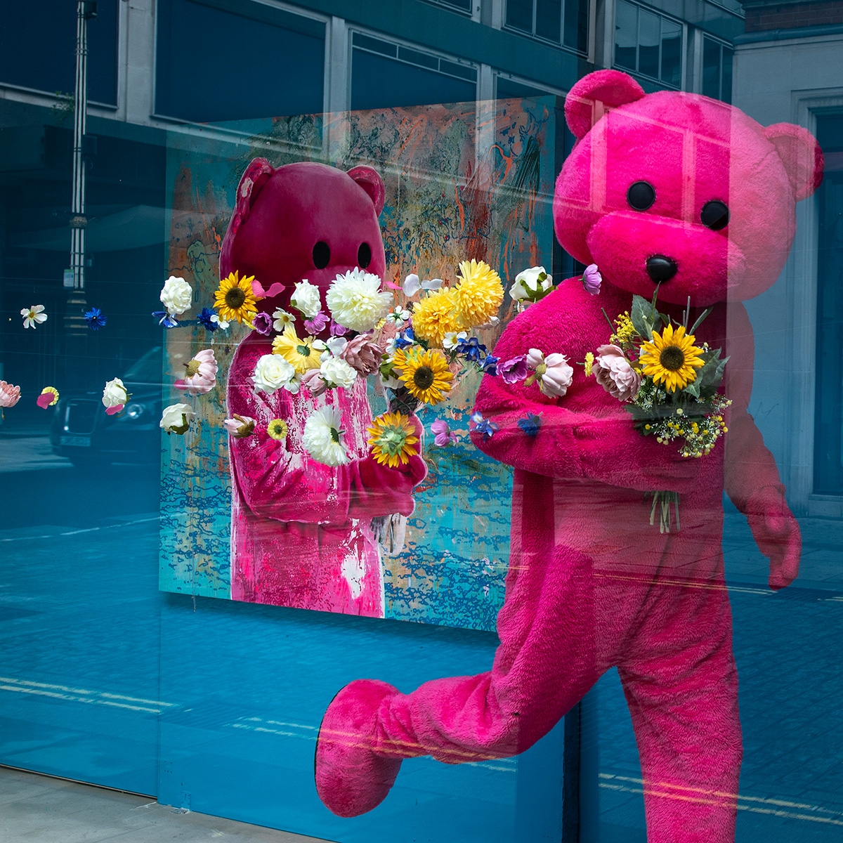 The Pink Bear is running with a bouquet of flowers which are unravelling behind.