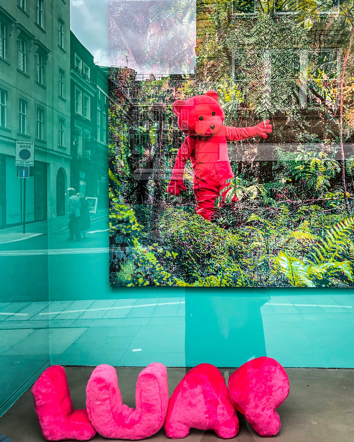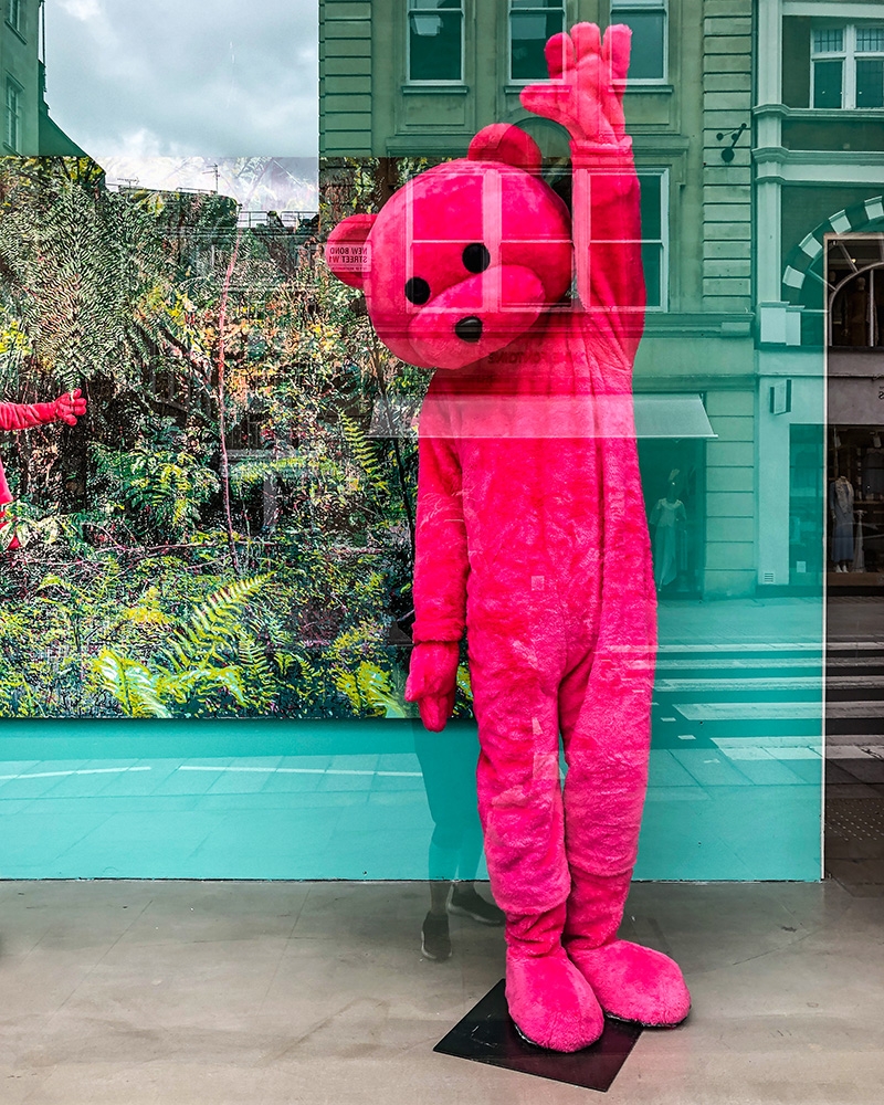 The Pink Bear is reaching high, waving positive energy, reaching to the stars, climbing high, giving high 5’s to the world and saying ‘we can do this’.
