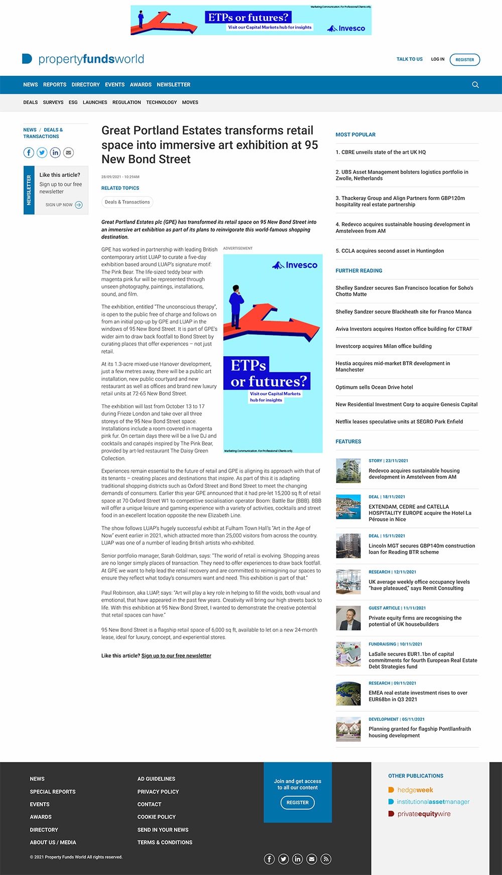 LUAP's solo exhbition at New Bond Street 'The Unconscious Therapy' is featured in Property Funds World