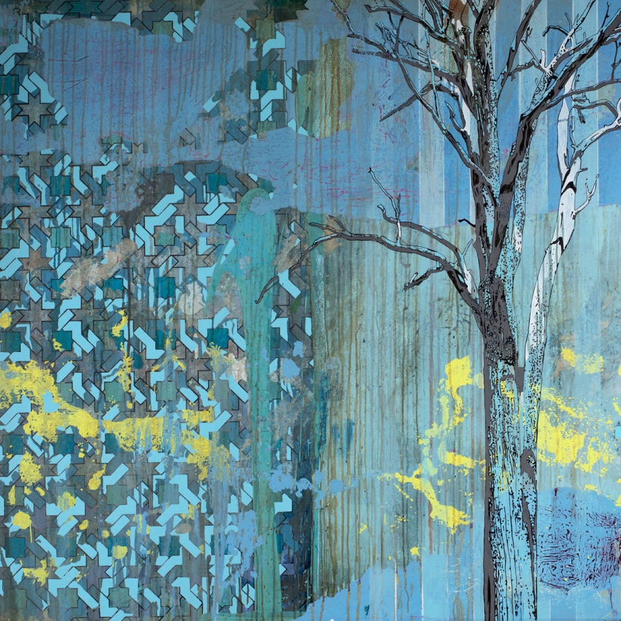 “Paul Robinson makes painting of trees and landscapes and mixes them up with the decorative patterns of wallpaper. The complexity of Robinson’s imagery and overlaying of pattern has been informed by the work of Robert Rauschenberg. Robinson paints a world, which joins Christopher Wool’s fabric paintings with a 1970’s Peter Phillips pop landscape. These images are reminiscence of dream sequences from 1960’s films; a drug trip depicted in solarisation photography where the image recorded is wholly or partially reversed in tone.”