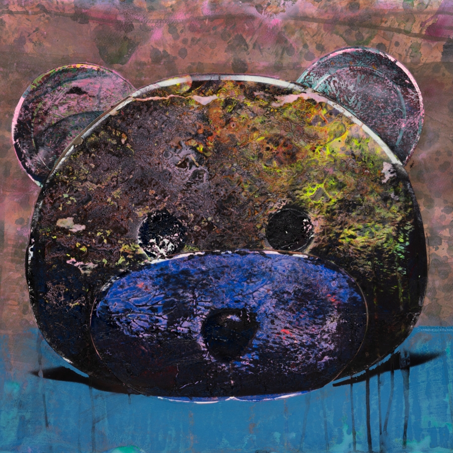 In the forest the bear is no longer a mascot for a theme park or TV show but becomes a mystical figure of a fantasy make believe world. The Pink Bear is not a man in a costume, it is an alter ego. The partially costume dressed figure is the transformation between reality and make believe, innocence and corruption. The pink bear has a whimsical sense of playfulness through its association with childhood memories, yet remains firmly attached to adulthood through the tainted surfaces that surround the character in the abstract spaces of the paintings.