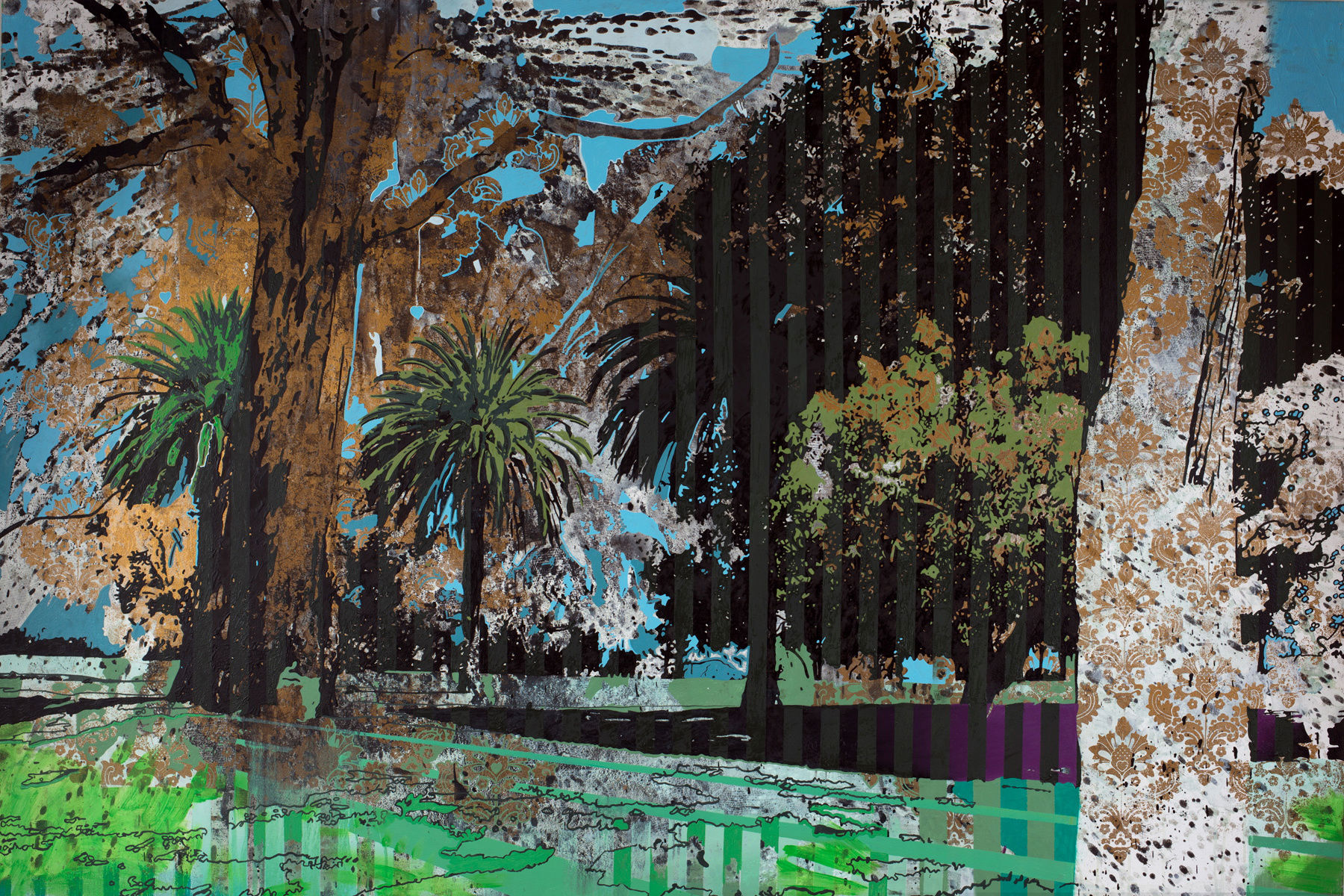 “Paul Robinson makes painting of trees and landscapes and mixes them up with the decorative patterns of wallpaper. The complexity of Robinson’s imagery and overlaying of pattern has been informed by the work of Robert Rauschenberg. Robinson paints a world, which joins Christopher Wool’s fabric paintings with a 1970’s Peter Phillips pop landscape. These images are reminiscence of dream sequences from 1960’s films; a drug trip depicted in solarisation photography where the image recorded is wholly or partially reversed in tone.”