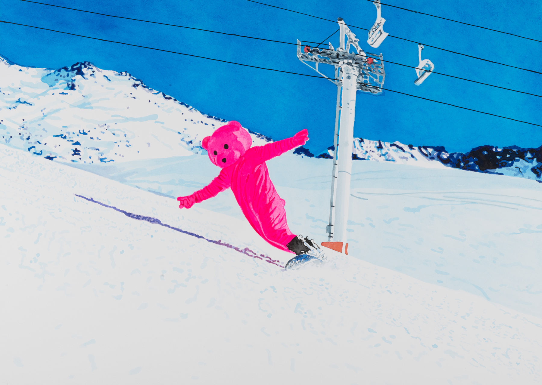 Pink Bear Is Coming To Town, 2022, Watercolour and Ink on Somerset 650 gsm White Velvet, 76cm x 56cm, Watercolour
