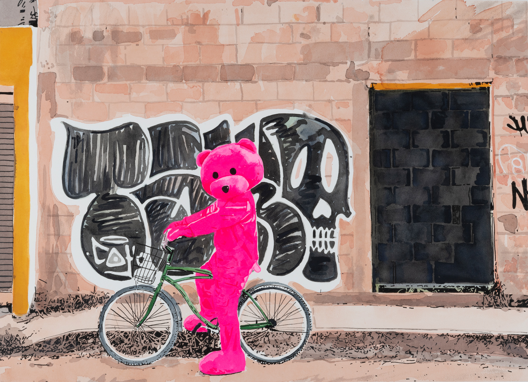 Read more about 'Pink Bear Is Coming To Town' Death's Door study Pink Bear Is Coming To Town, 2022, Watercolour and Ink on Somerset 650 gsm White Velvet, 76cm x 56cm, Watercolour Pink Bear Is Coming To Town View 'Pink Bear Is Coming To Town' series