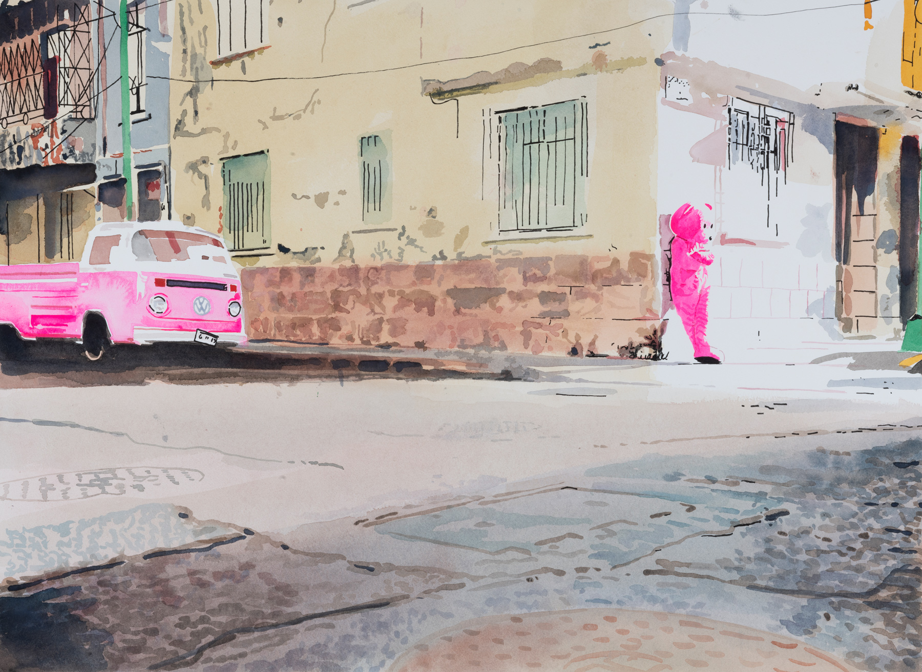 Read more about 'Pink Bear Is Coming To Town' Pink Clouds And Silver Linings study Pink Bear Is Coming To Town, 2022, Watercolour and Ink on Somerset 650 gsm White Velvet, 76cm x 56cm, Watercolour Pink Bear Is Coming To Town View 'Pink Bear Is Coming To Town' series