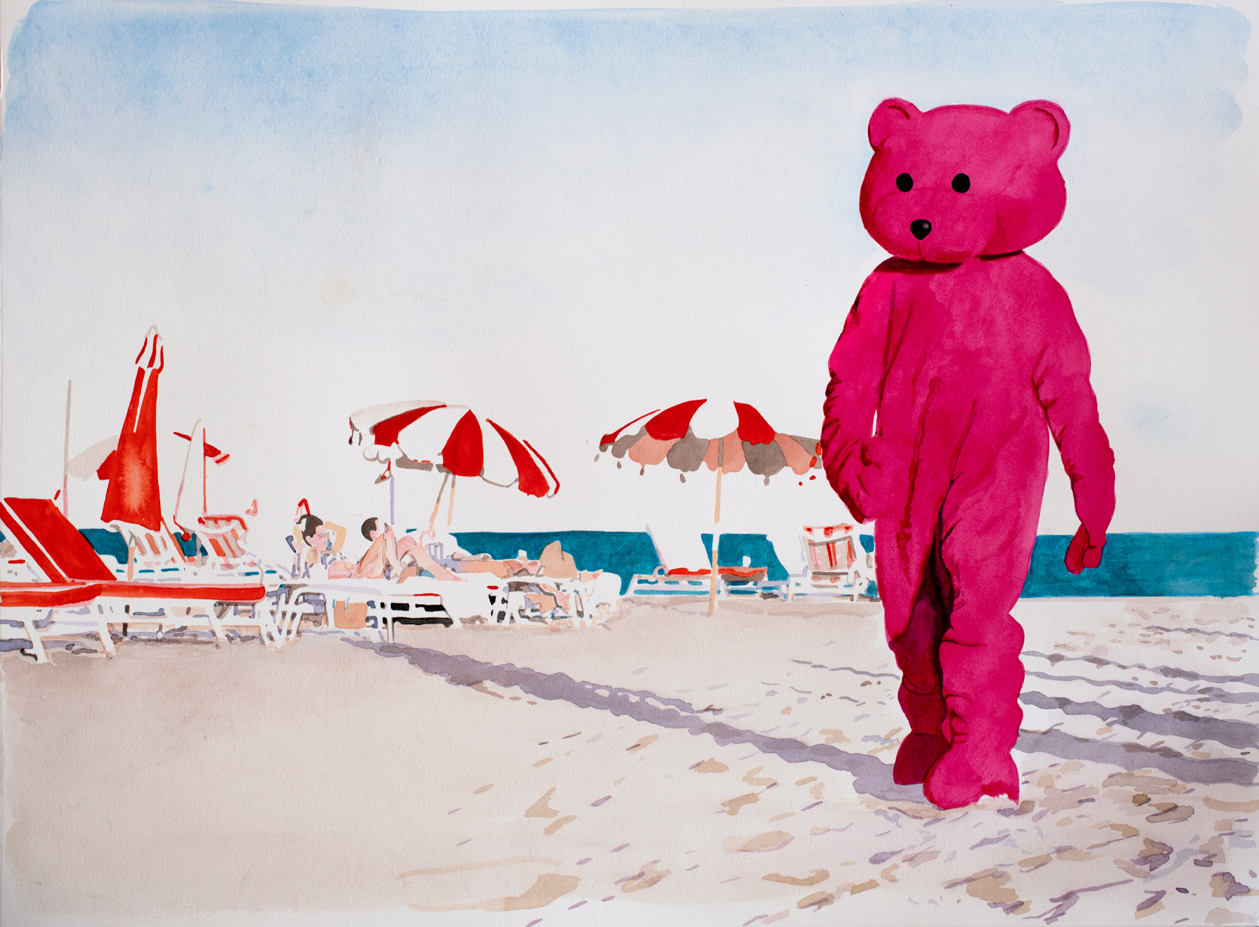Read more about 'Pink Bear Is Coming To Town' untitled watercolour study Pink Bear Is Coming To Town, 2020, Watercolour and Ink on Somerset 650 gsm White Velvet, 76cm x 56cm, Watercolour Pink Bear Is Coming To Town View 'Pink Bear Is Coming To Town' series