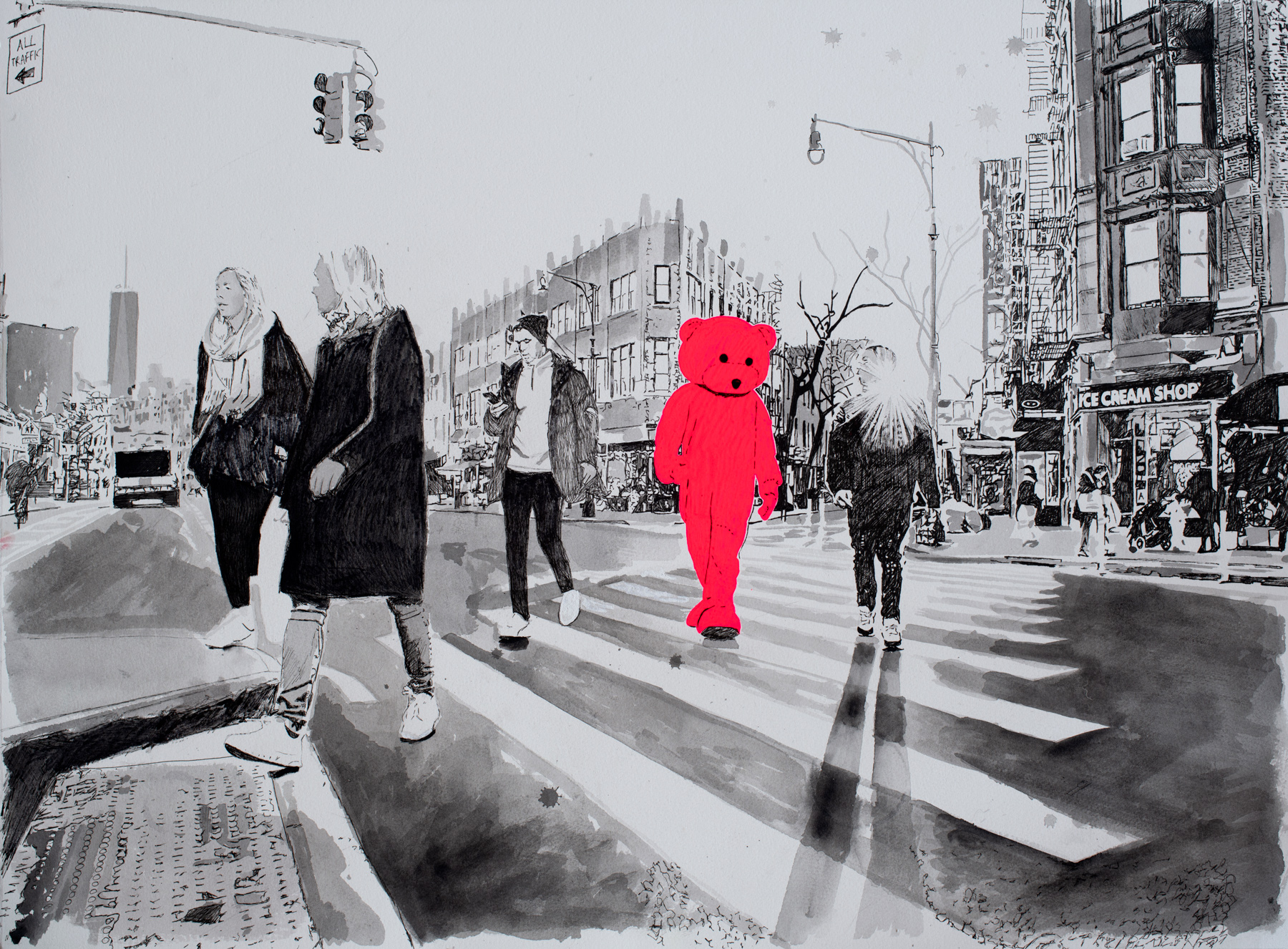 Pink Bear Is Coming To Town, 2020, Watercolour and Ink on Somerset 650 gsm White Velvet, 76cm x 56cm, Watercolour