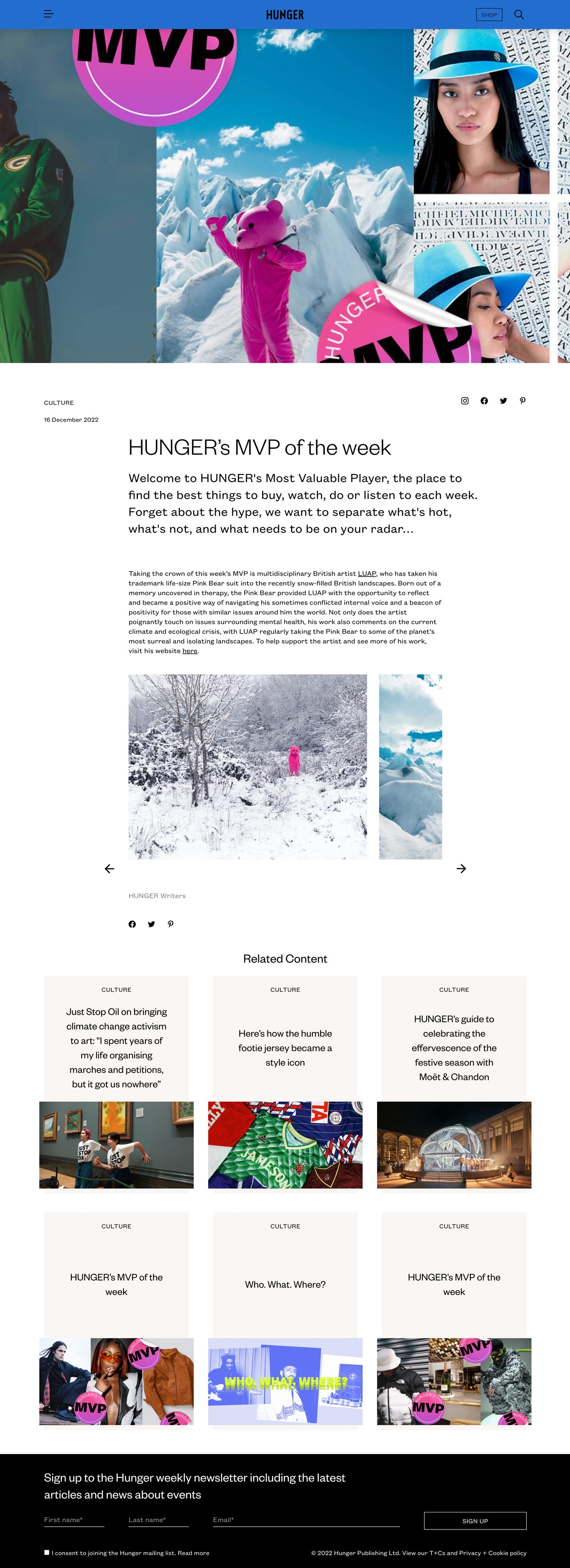 Taking the crown of this week’s MVP is multidisciplinary British artist LUAP, who has taken his trademark life-size Pink Bear suit into the recently snow-filled British landscapes. Born out of a memory uncovered in therapy, the Pink Bear provided LUAP with the opportunity to reflect and became a positive way of navigating his sometimes conflicted internal voice and a beacon of positivity for those with similar issues around him the world. Not only does the artist poignantly touch on issues surrounding mental health, his work also comments on the current climate and ecological crisis, with LUAP regularly taking the Pink Bear to some of the planet’s most surreal and isolating landscapes.