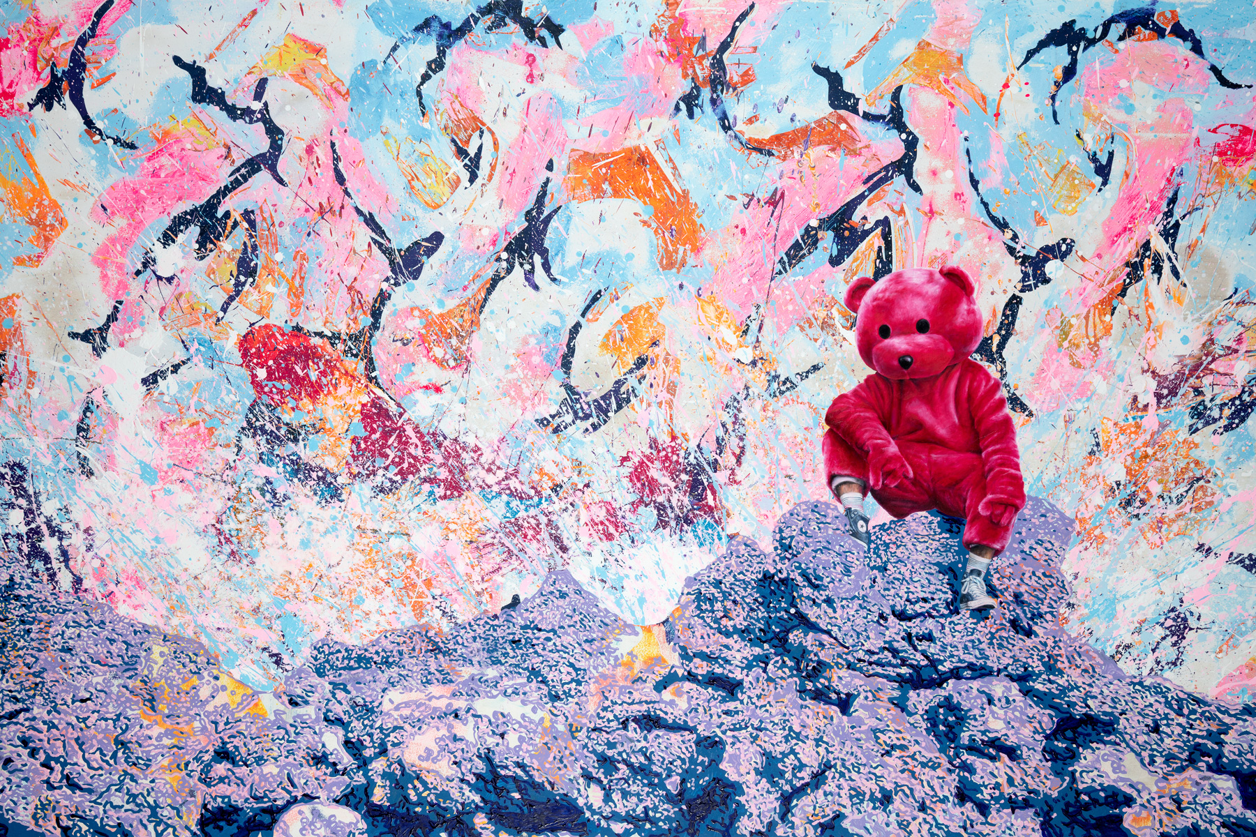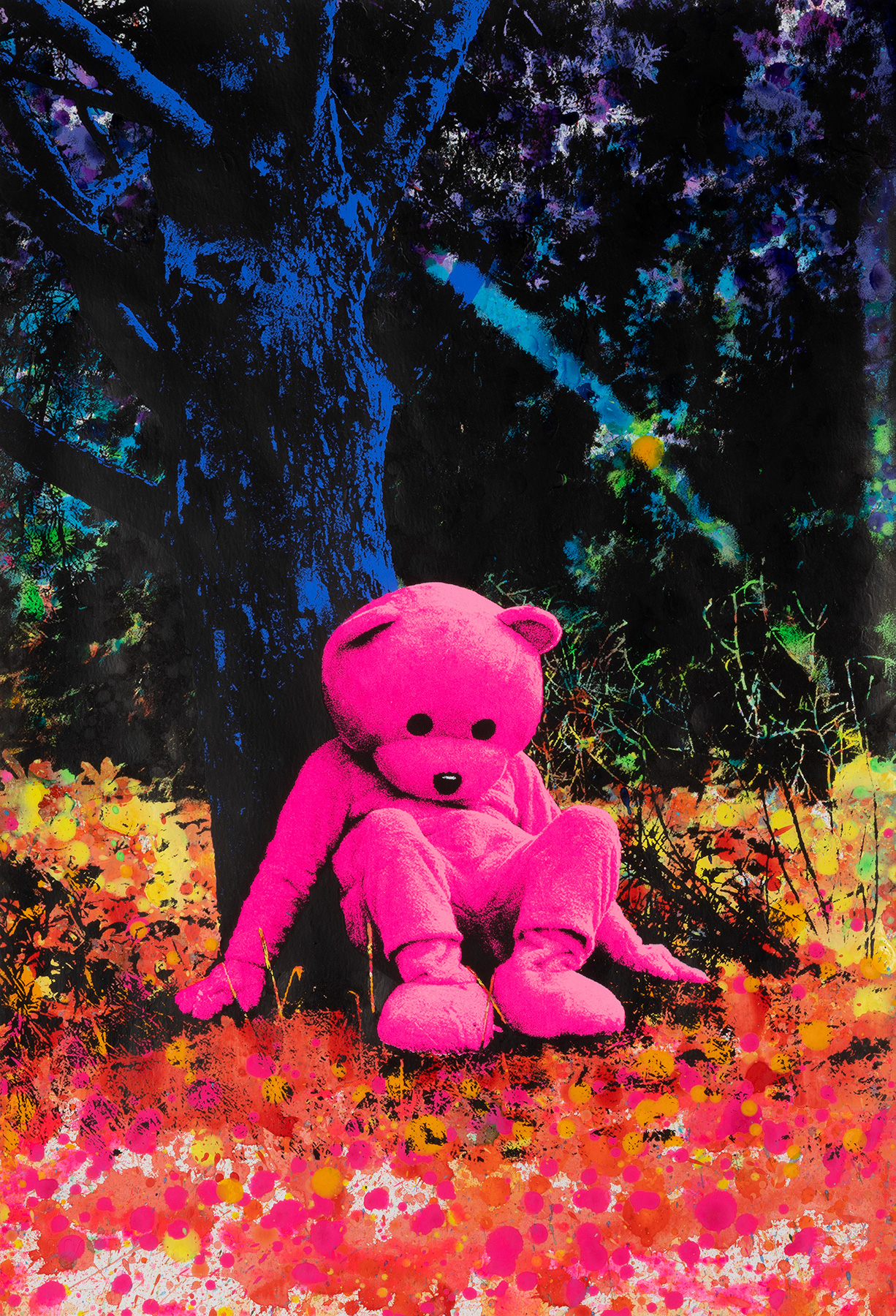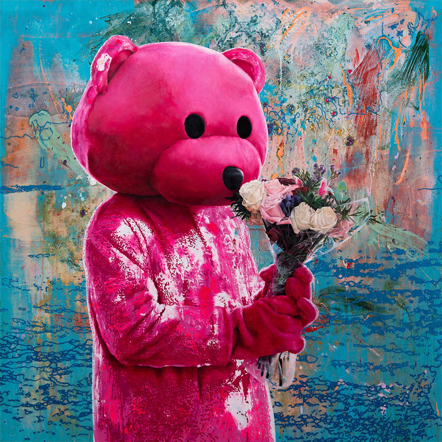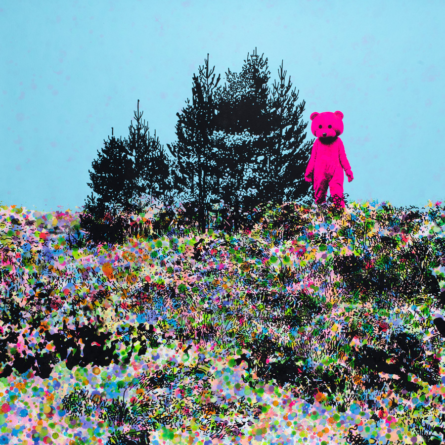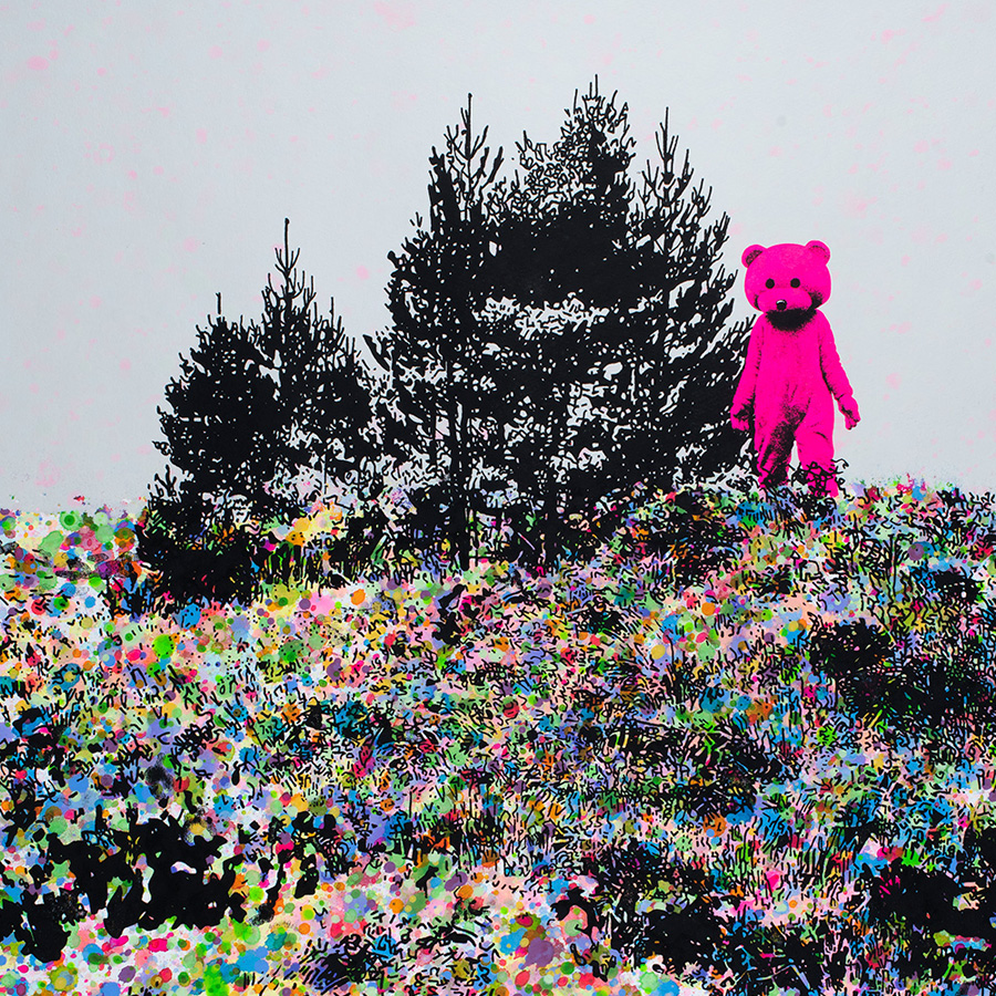 In his debut solo exhibition with Andipa Gallery titled ‘A Hero’s Journey’, New Contemporary artist Paul Robinson produces a vivid collection of paintings, photography and unique prints telling the fantastical story of alter ego Pink Bear.