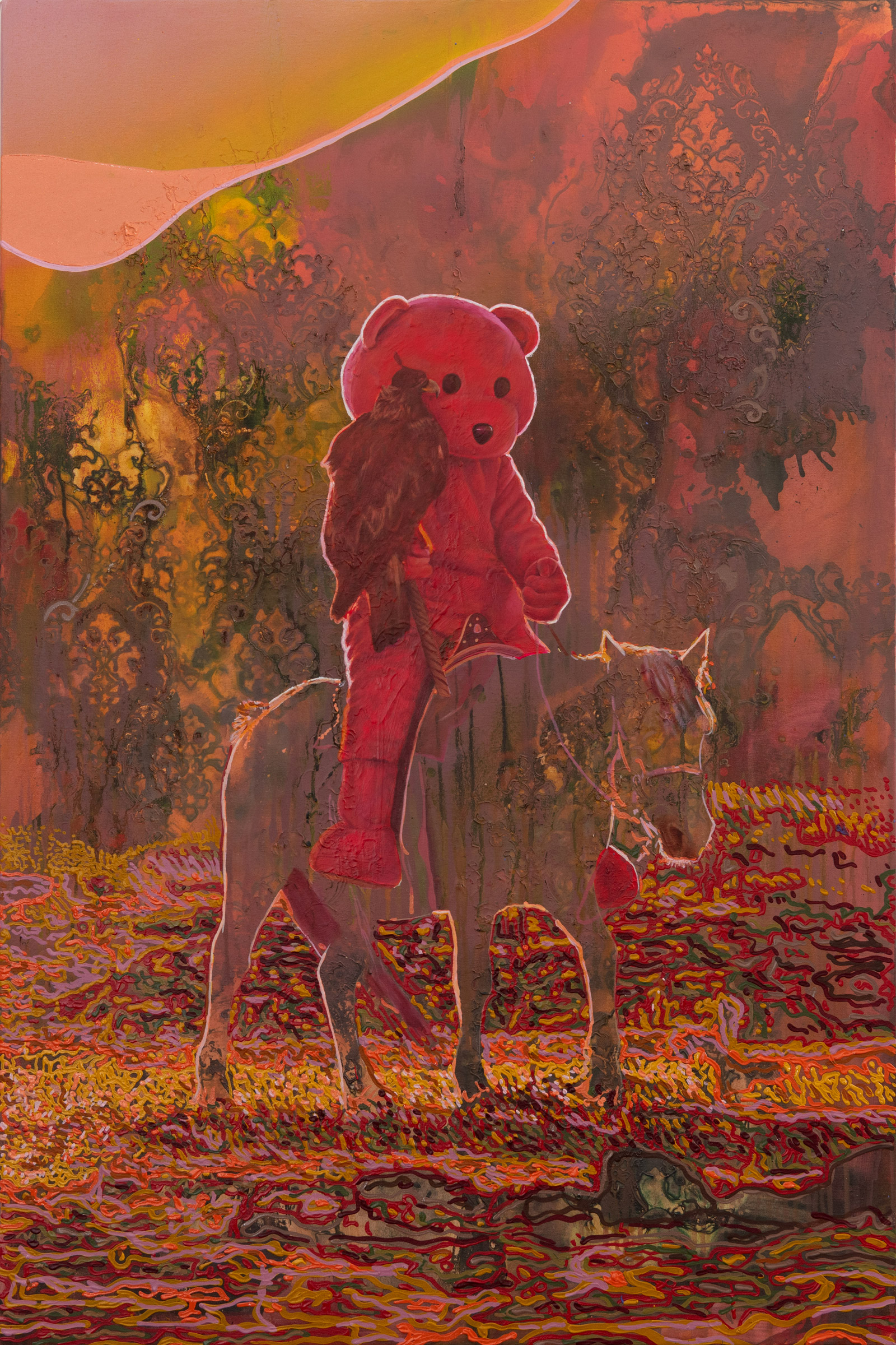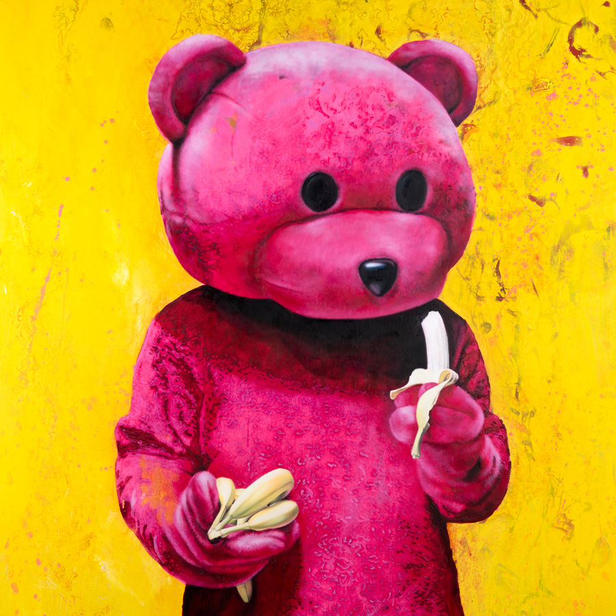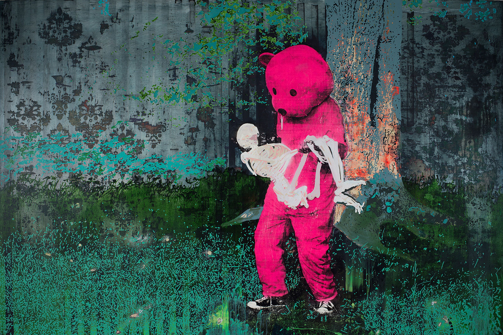 In the forest the bear is no longer a mascot for a theme park or TV show but becomes a mystical figure of a fantasy make believe world. The Pink Bear is not a man in a costume, it is an alter ego. The partially costume dressed figure is the transformation between reality and make believe, innocence and corruption. The pink bear has a whimsical sense of playfulness through its association with childhood memories, yet remains firmly attached to adulthood through the tainted surfaces that surround the character in the abstract spaces of the paintings.