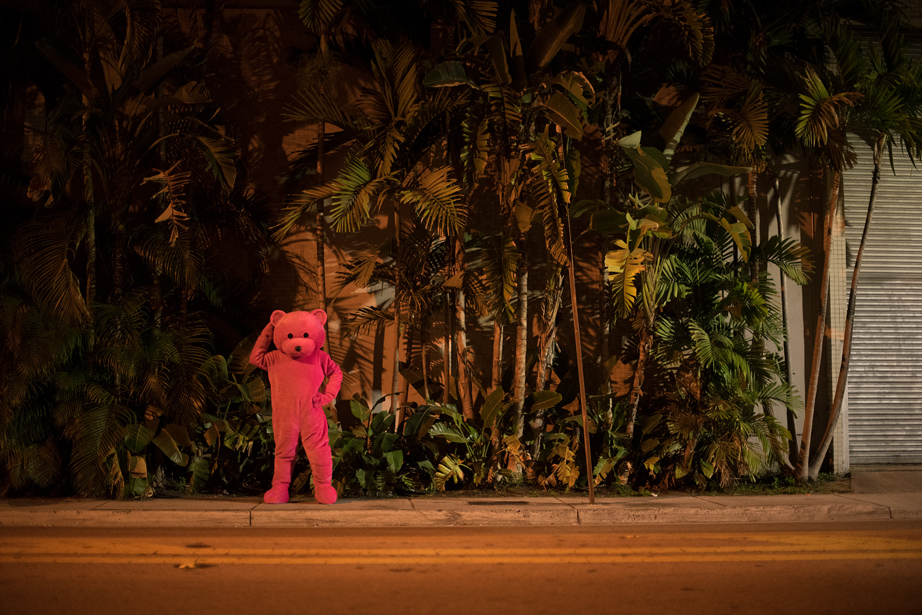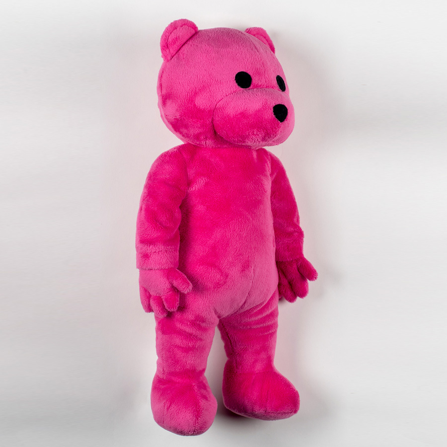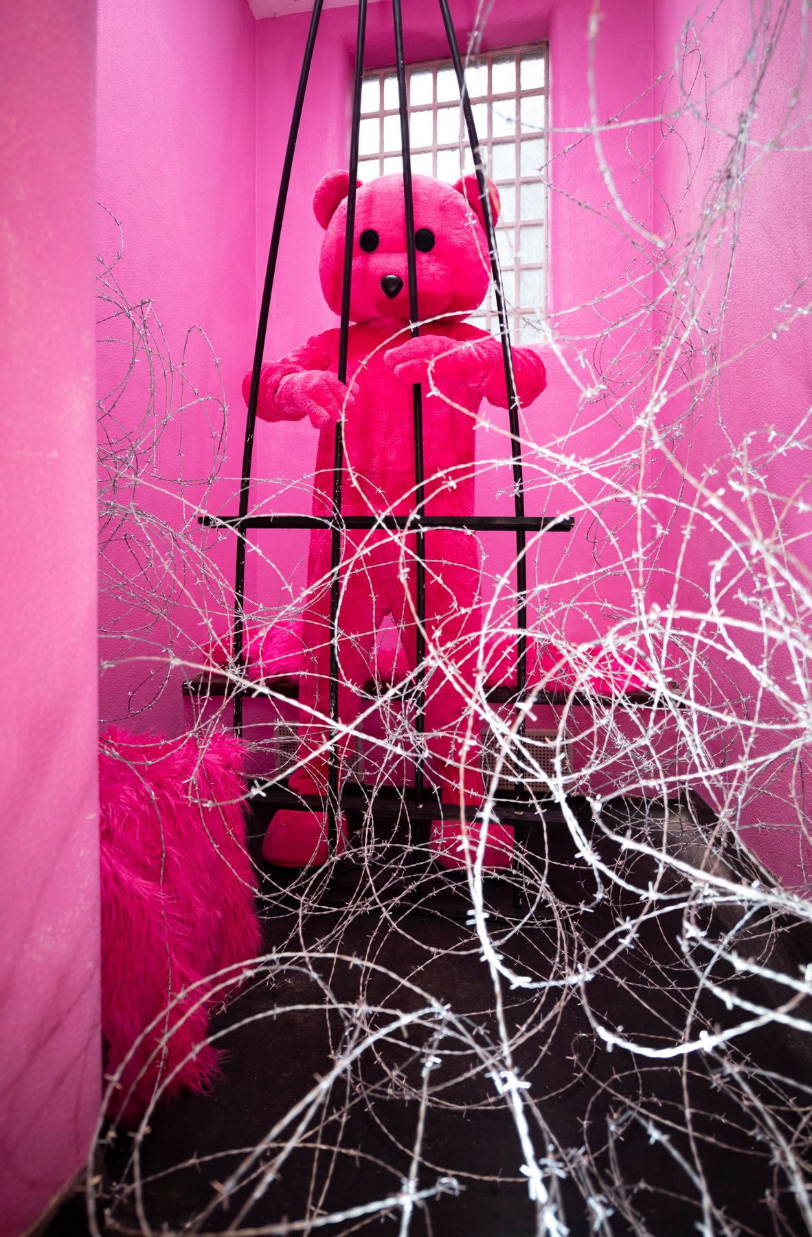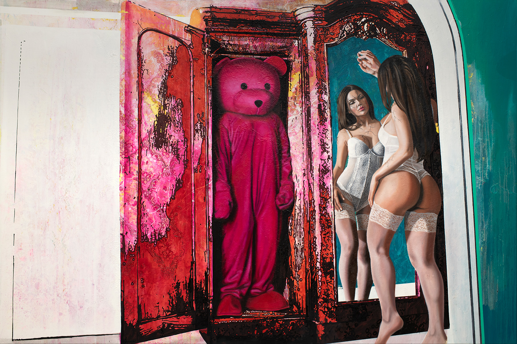 In the forest the bear is no longer a mascot for a theme park or TV show but becomes a mystical figure of a fantasy make believe world. The Pink Bear is not a man in a costume, it is an alter ego. The partially costume dressed figure is the transformation between reality and make believe, innocence and corruption. The pink bear has a whimsical sense of playfulness through its association with childhood memories, yet remains firmly attached to adulthood through the tainted surfaces that surround the character in the abstract spaces of the paintings.