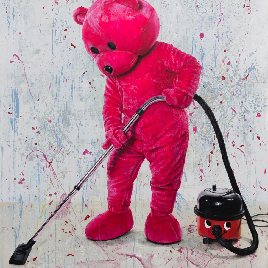 In the forest the bear is no longer a mascot for a theme park or TV show but becomes a mystical figure of a fantasy make believe world. The Pink Bear is not a man in a costume, it is an alter ego. The partially costume dressed figure is the transformation between reality and make believe, innocence and corruption. The pink bear has a whimsical sense of playfulness through its association with childhood memories, yet remains firmly attached to adulthood through the tainted surfaces that surround the character in the abstract spaces of the paintings.