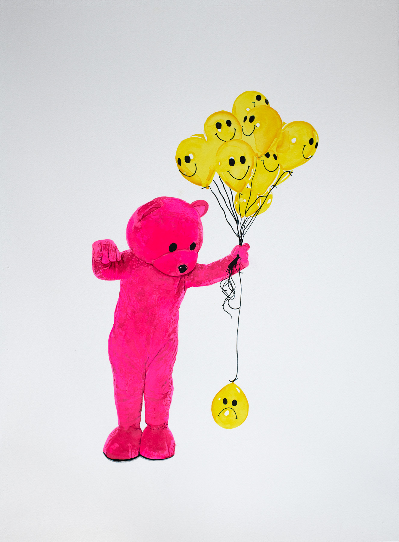 In the forest the bear is no longer a mascot for a theme park or TV show but becomes a mystical figure of a fantasy make believe world. The Pink Bear is not a man in a costume, it is an alter ego. The partially costume dressed figure is the transformation between reality and make believe, innocence and corruption. The pink bear has a whimsical sense of playfulness through its association with childhood memories, yet remains firmly attached to adulthood through the tainted surfaces that surround the character in the abstract spaces of the paintings.